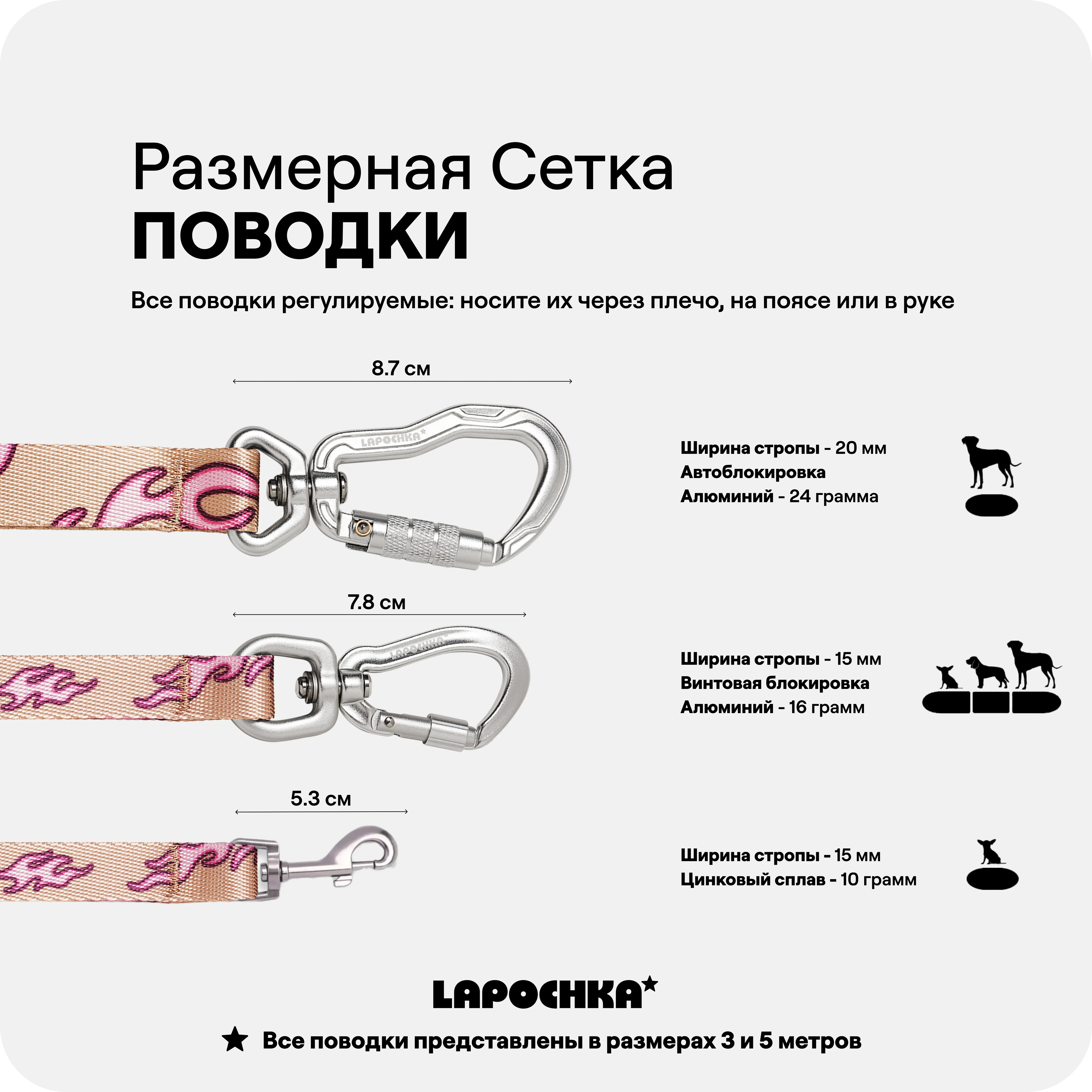 Поводки представлены с карабинами 3 видов: классический, винтовой и с автоблокировкой.