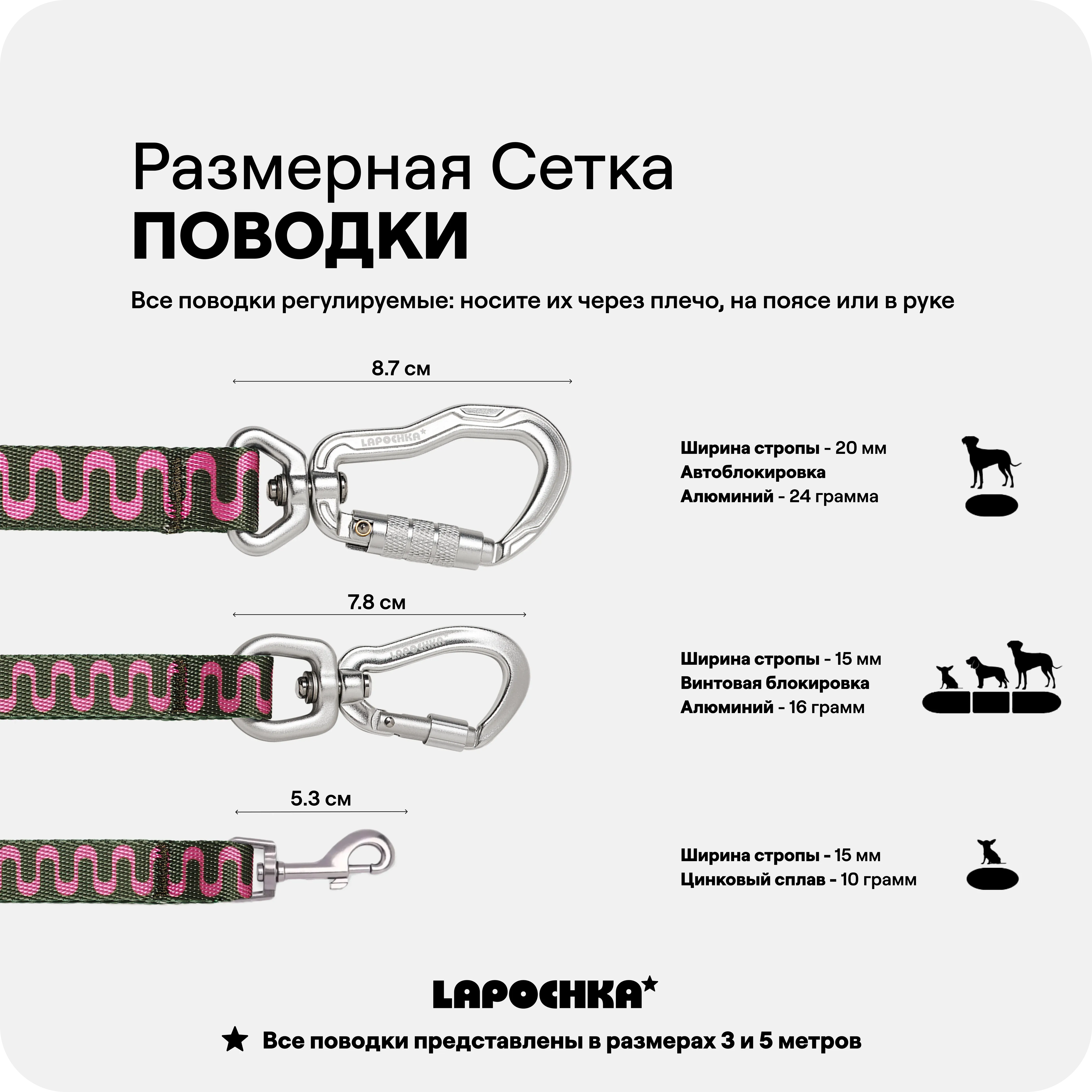 Поводки представлены с карабинами 3 видов: классический, винтовой и с автоблокировкой.