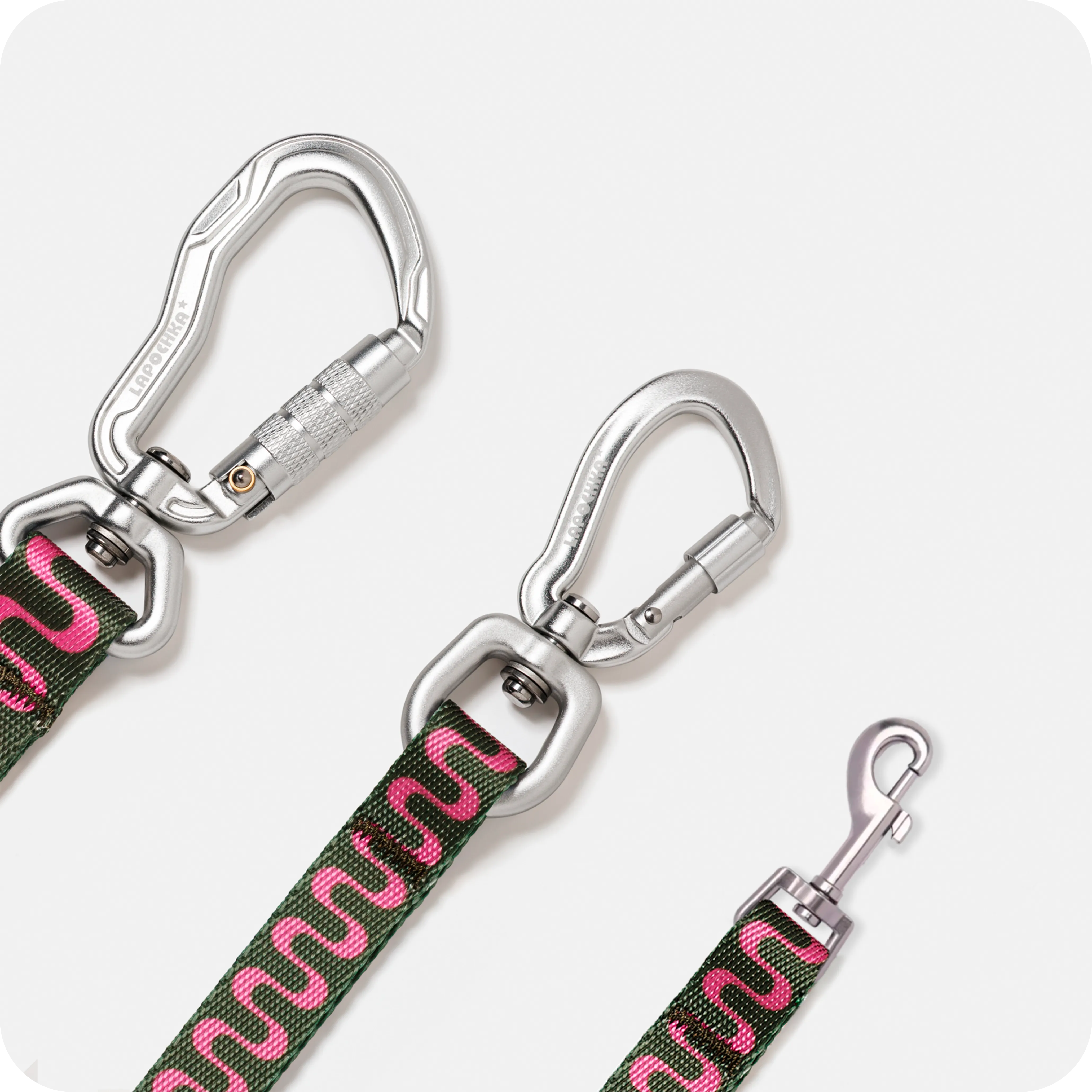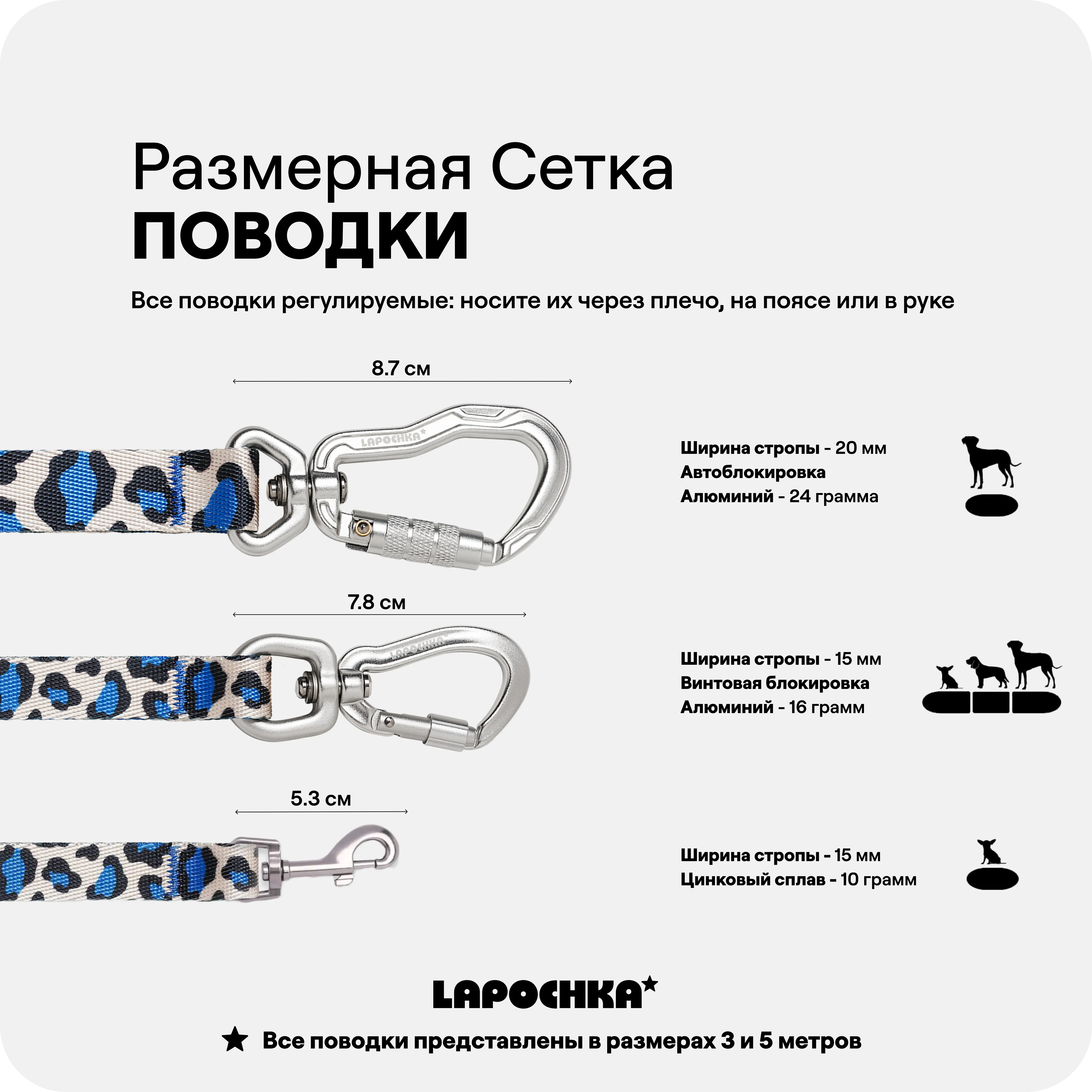 Поводки представлены с карабинами 3 видов: классический, винтовой и с автоблокировкой.